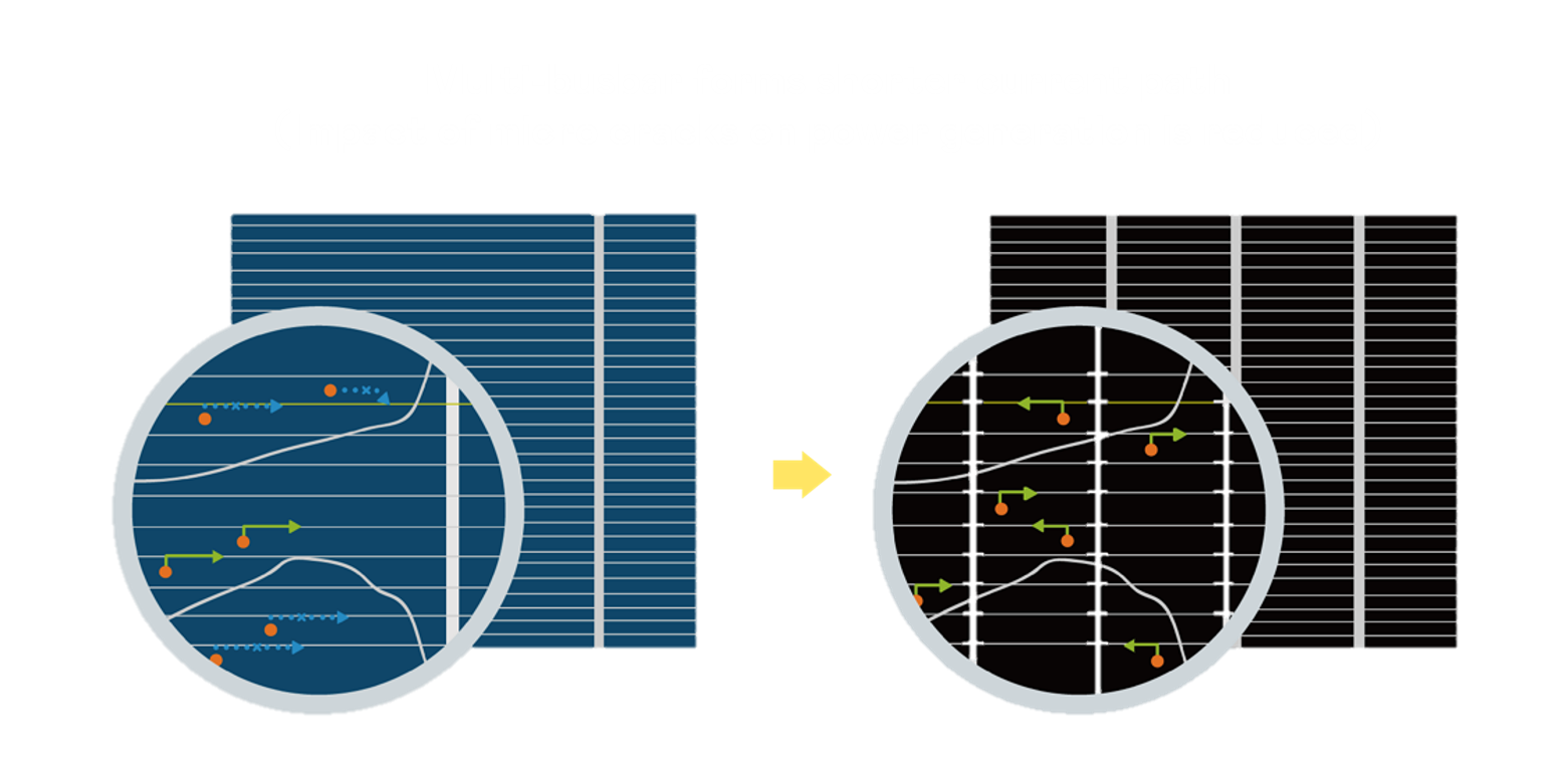 - 电池使用多条铜导线 (Copper wire) 于电池片上形成较短的电流路径,提高电流收集效率,采用圆形设计的铜导线较传统扁平式的铜焊带 (Ribbon),可增加入射至电池的光线量。